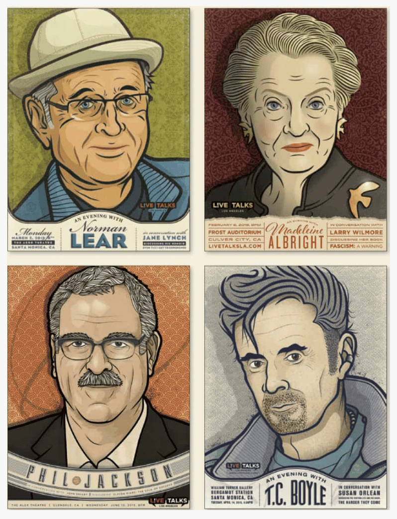 Since the inception of Live Talks Los Angeles, we have commissioned posters for select events (over 70 so far) from artist Thomas Jennings. For the first time, they will all be exhibited together in the Pop Up Store! In December 2026, they’ll be collected in a beautifully designed coffee table book accompanied with excerpts from the associated conversations.
